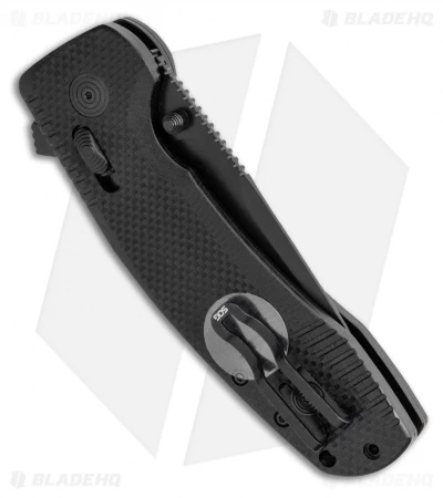 This TAC XR has a black handle, a partially serrated black blade and all black hardware.